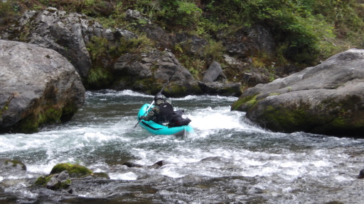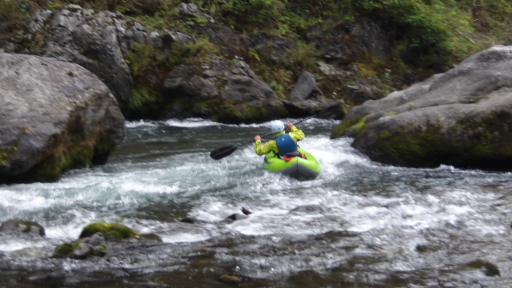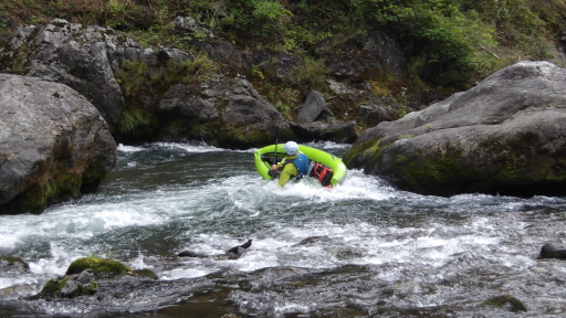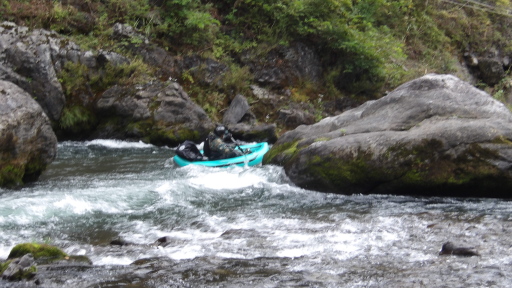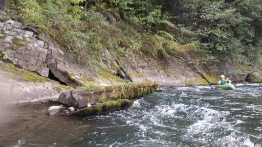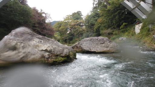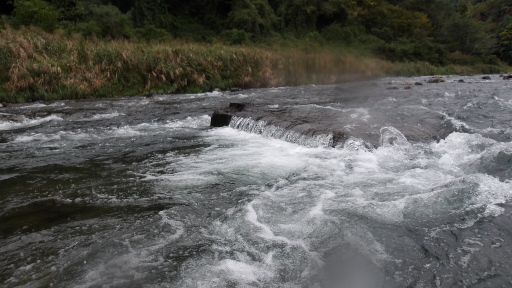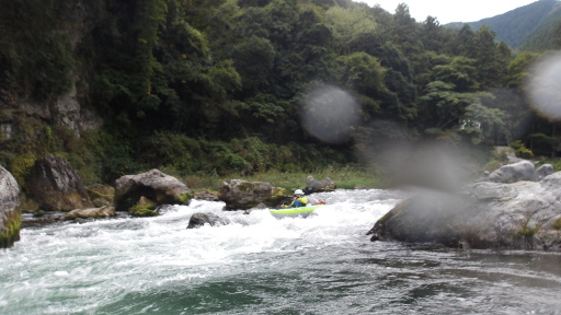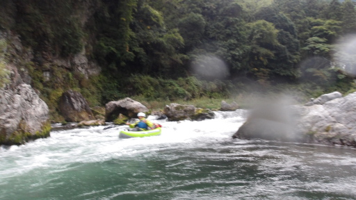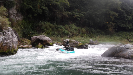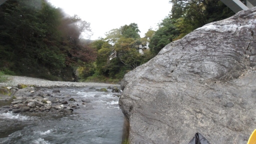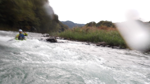 今度は右から入りますが、全然ダメ。さらに2個目の岩にぶつかって流れに喰われそうになるのを手を出して岩を押さえてなんとかクリア。