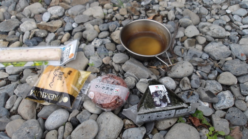 ■昼食:おにぎりとオニオンスープ、コーヒー、頂き物のイカかまバーとバウムクーヘン。