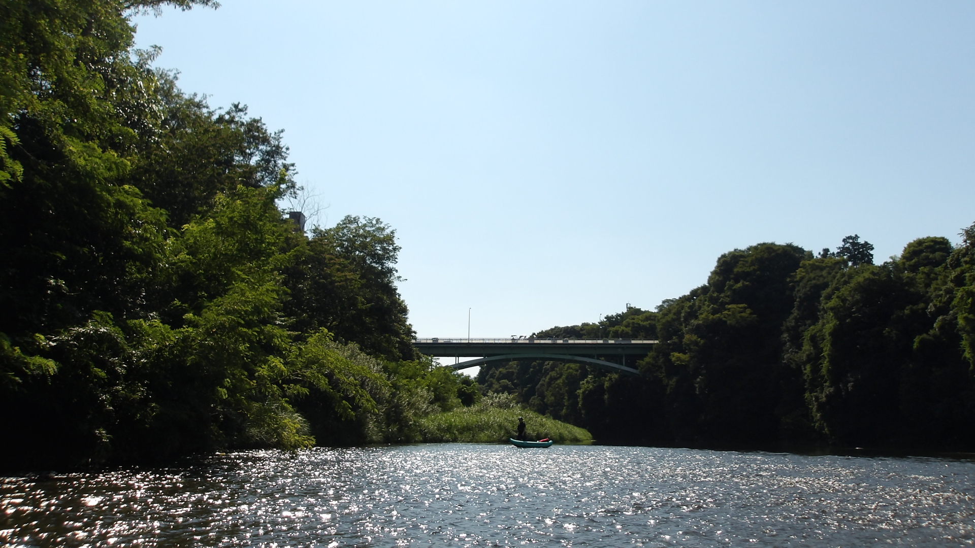 それで、鵜の瀬橋の辺りをいい感じに漕いでいましたら、左岸の川原で「駐在刑事」? の撮影やってました。