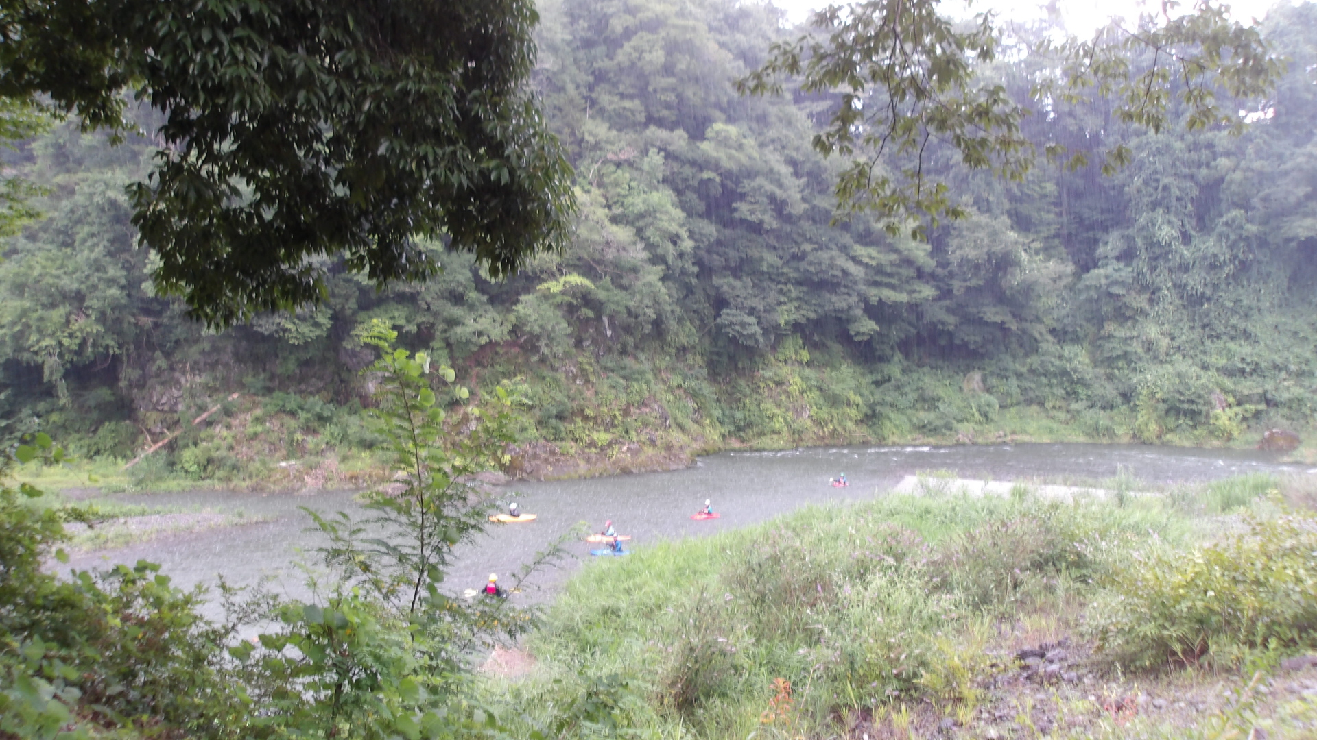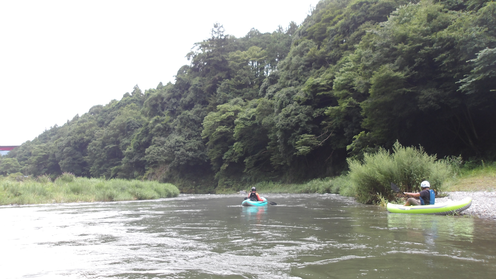 漂流する艇を追いかけて確保したものの、私の装備(荷締めベルト)では、クイックリリースバックルがKさんの艇のバウにあるD環を通せず、いろいろやっているうちにだいぶ漂流してしまい、なんとか瀞場が終わるギリギリのところで奥多摩園対岸の右岸に漂着。