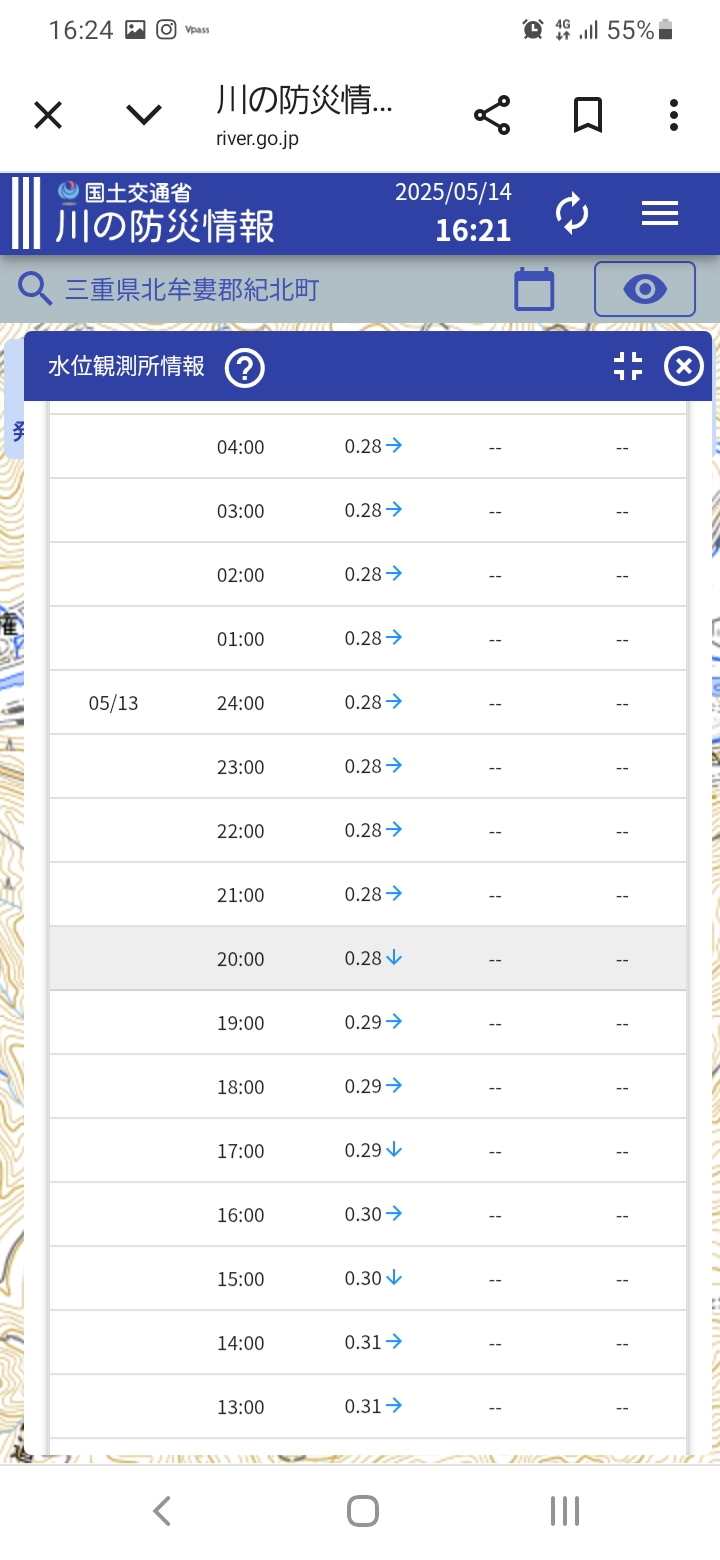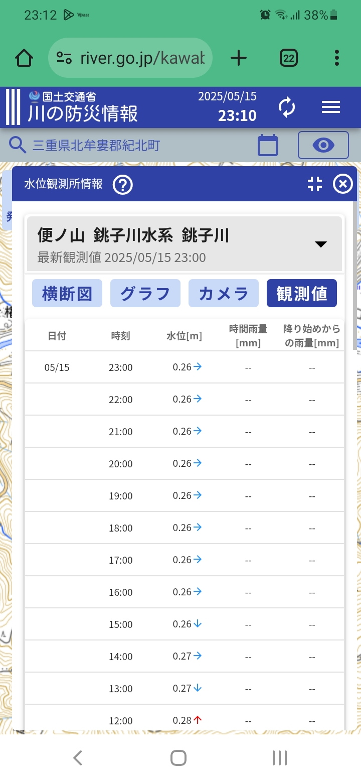 そして3日後、紀北町に着いた5/14午後時点の水位は、0.29。あちゃー。