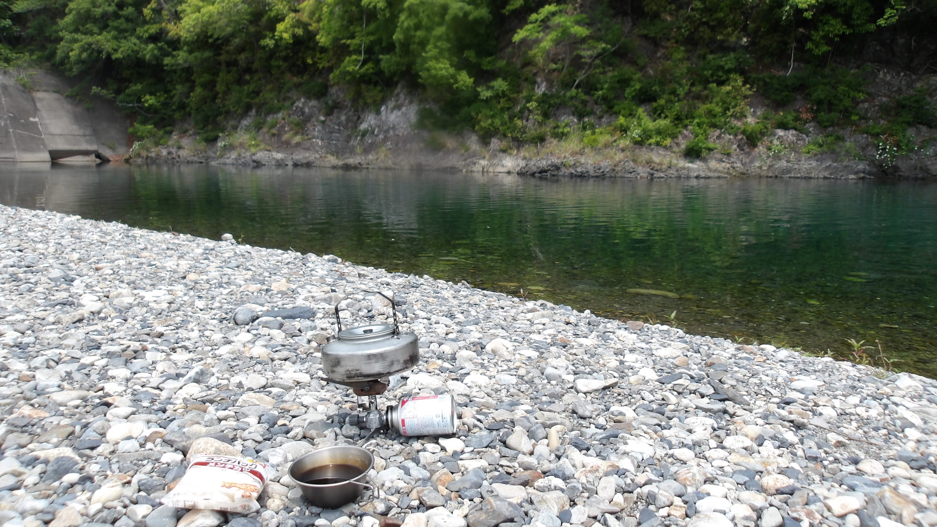 それでも水中眼鏡とシュノーケルは積んだままでした。というか、これは必要だと思って出発前に確認しました。10年放置でゴムの部分は微妙に薄黄色く変色しています。その他、ケトルやらシングルバーナーやら昼食のパンなども携えて川原に戻ります。