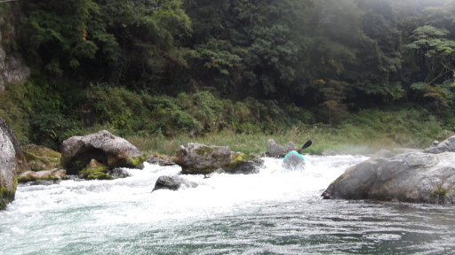 今度は右から入りますが、全然ダメ。さらに2個目の岩にぶつかって流れに喰われそうになるのを手を出して岩を押さえてなんとかクリア。